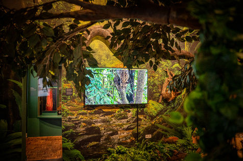 Daarnaast heeft deFine ook verschillende audio-oplossingen geleverd. Transparante kappen, zogeheten sound showers, hangen boven de bezoekers en richten het geluid specifiek op één plek. In de Jungle-kamer hebben we een soundscape gecreëerd: junglegeluiden die de bezoeker van verschillende kanten hoort, waardoor het echt voelt alsof je midden in de jungle staat.